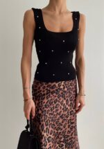 Жіночий Чорний Топ на Широких Бретелях з Камінцями та Квадратним Вирізом