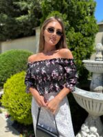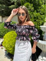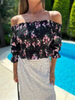 Жіночий Чорний Топ у Квітах з Відкритими Плечами та Укороченими Об’ємними Рукавами