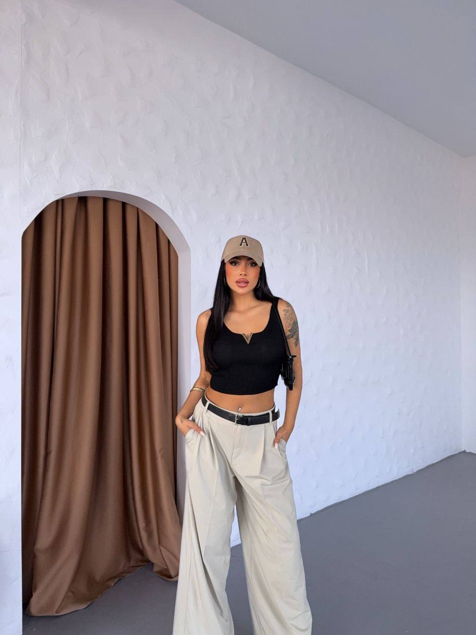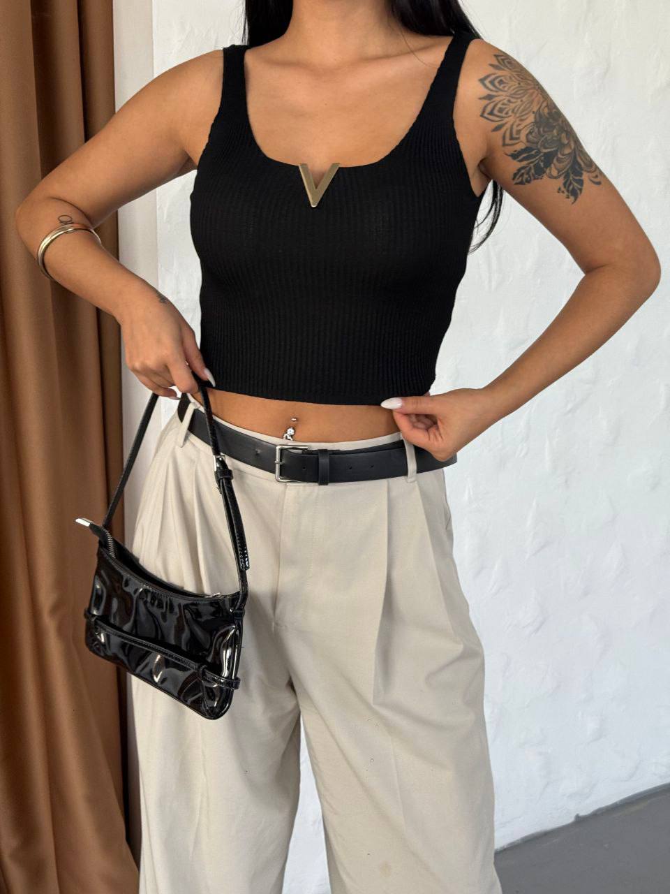 Жіночий Чорний Топ в Рубчик з V-подібним Вирізом та Металевим Декором