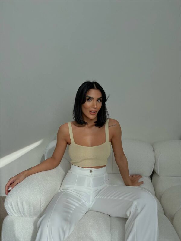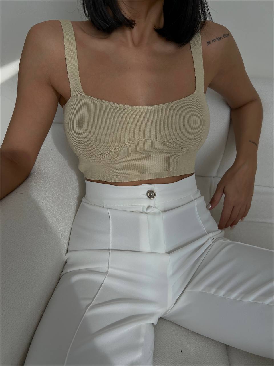 Жіночий Короткий Бежевий Топ на Широких Бретелях із Фігурним Швом під Грудьми