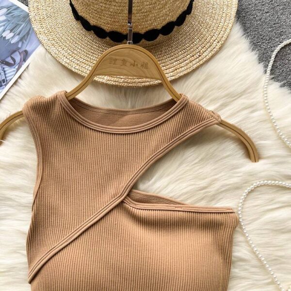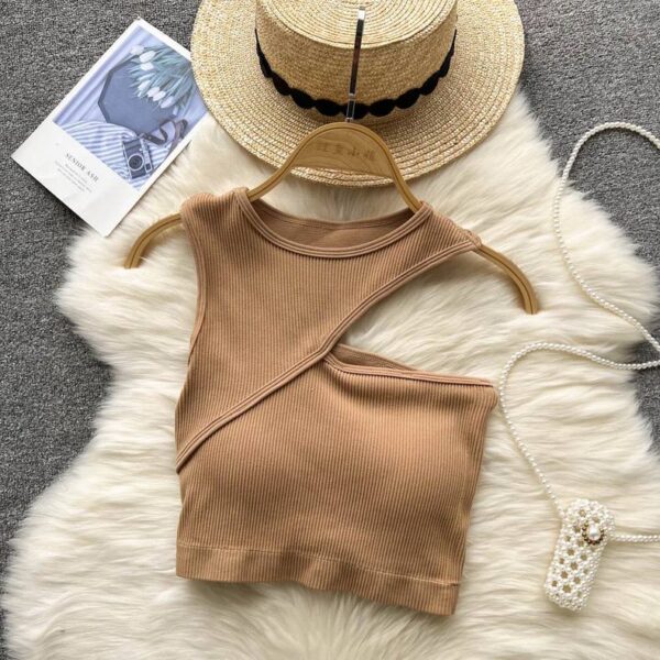 Жіночий Трикотажний Бежевий Топ в Рубчик з Вирізом та Чашечками