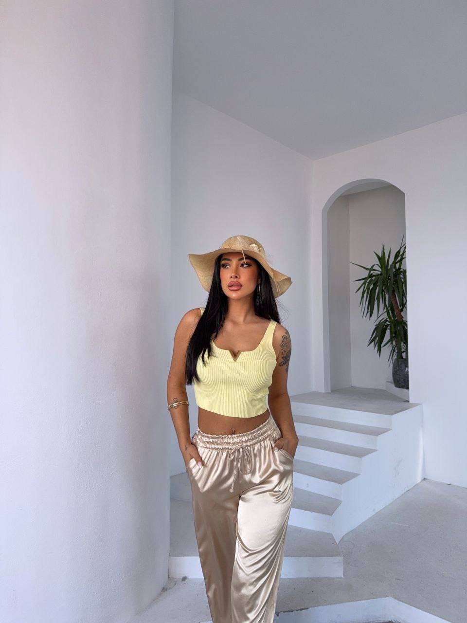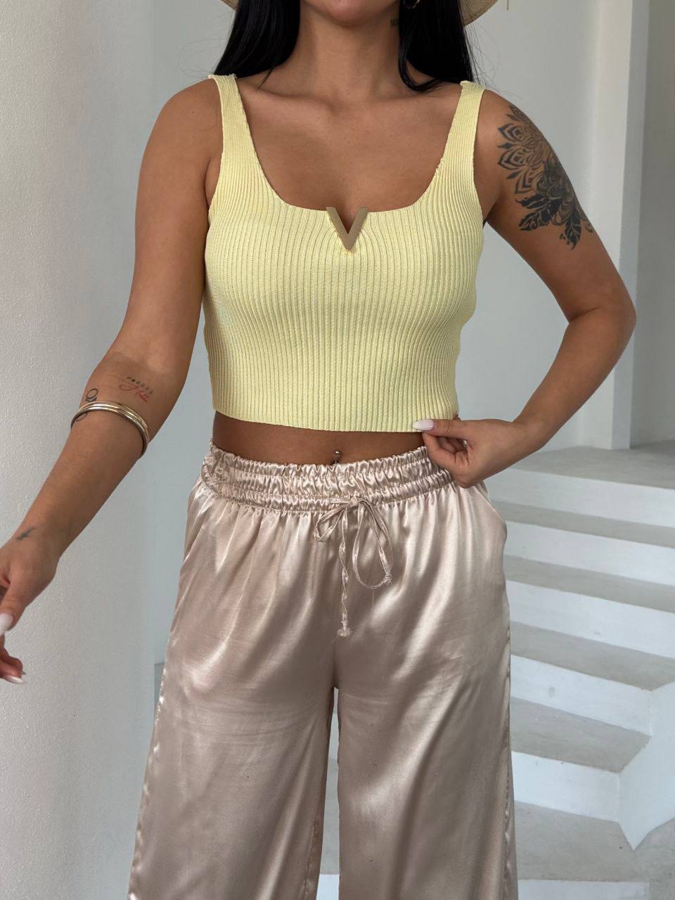 Жіночий Жовтий Топ в Рубчик з V-подібним Вирізом та Металевим Декором