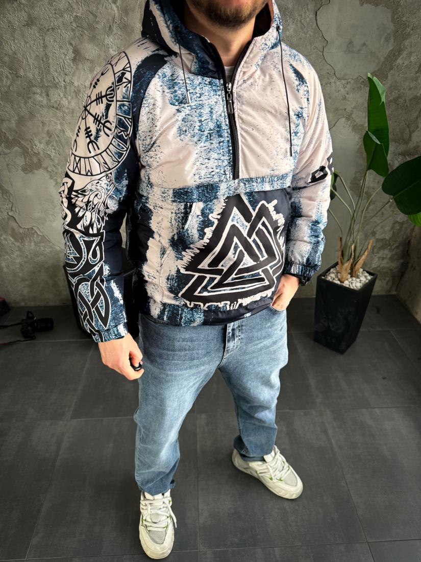 Чоловічий Синій Анорак Оверсайз Плащівка – Утеплений з Капюшоном в Принт Птах