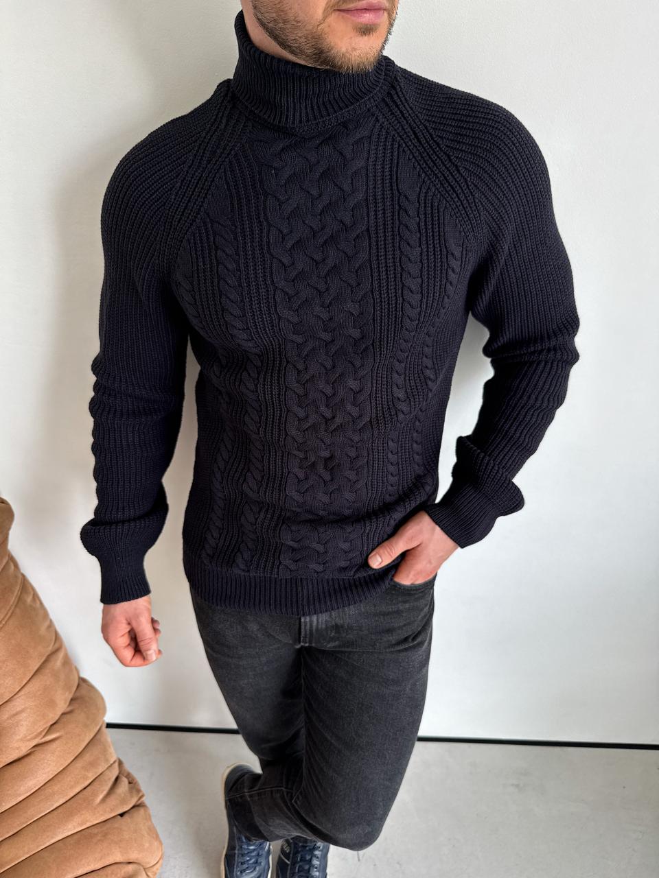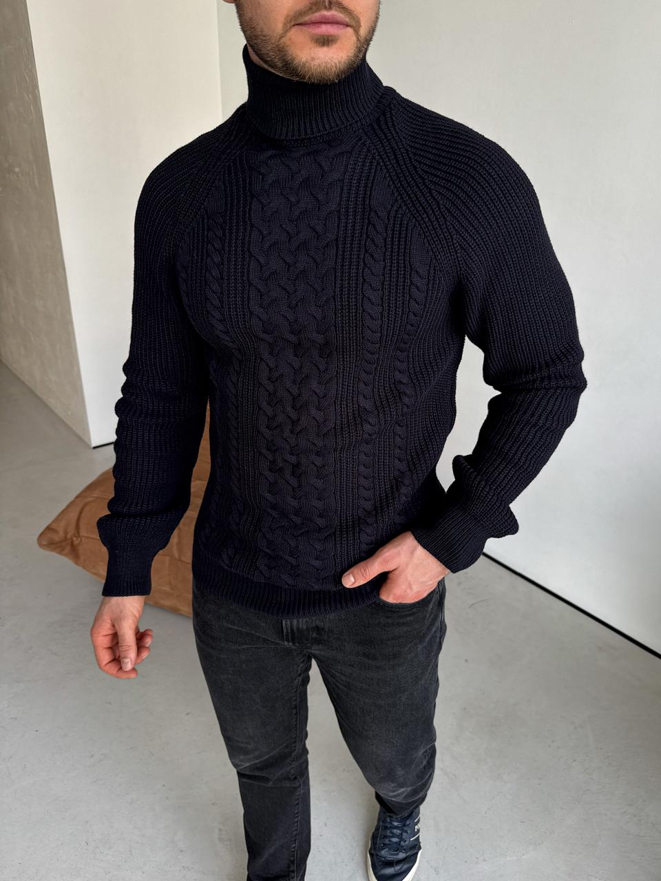 Чоловічий Теплий Класичний Темно-Синій Светр Косичка з Високою Горловиною