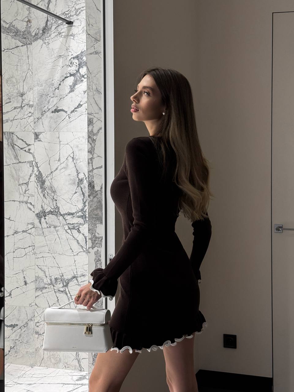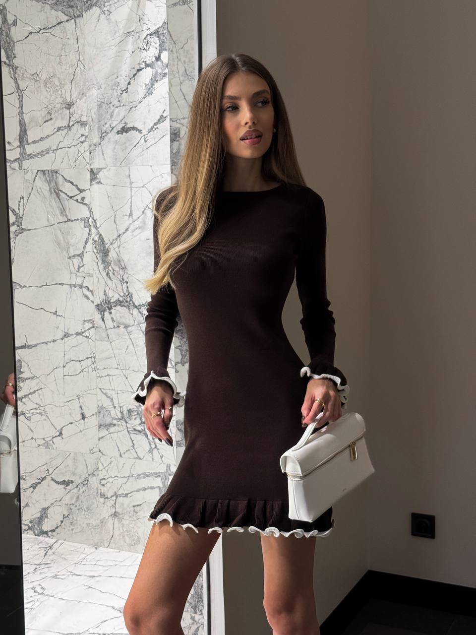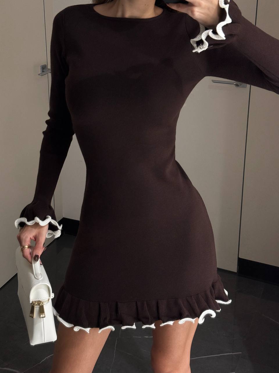 Жіноча Приталена Коричнева Сукня Міні з Окантовкою та Воланами