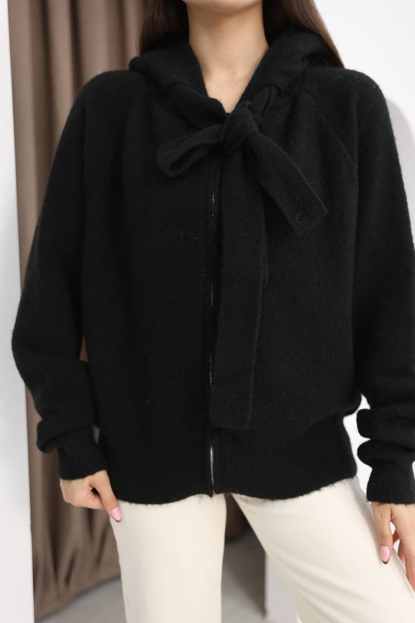 Жіноча Тепла Чорна Кофта Вільного Крою на Блискавці з Капюшоном на Зав’язці