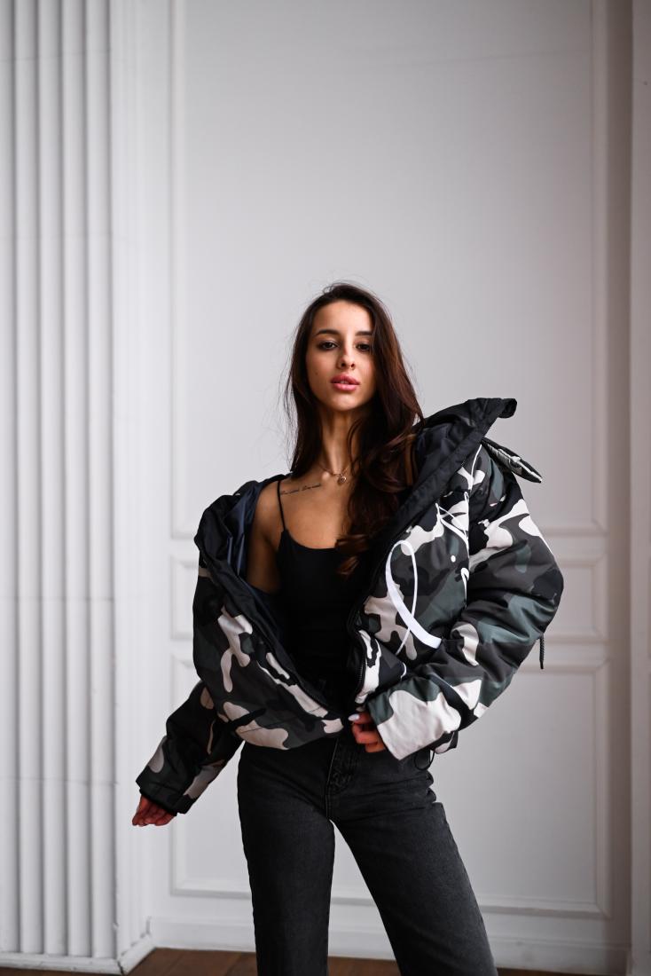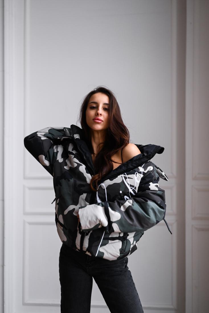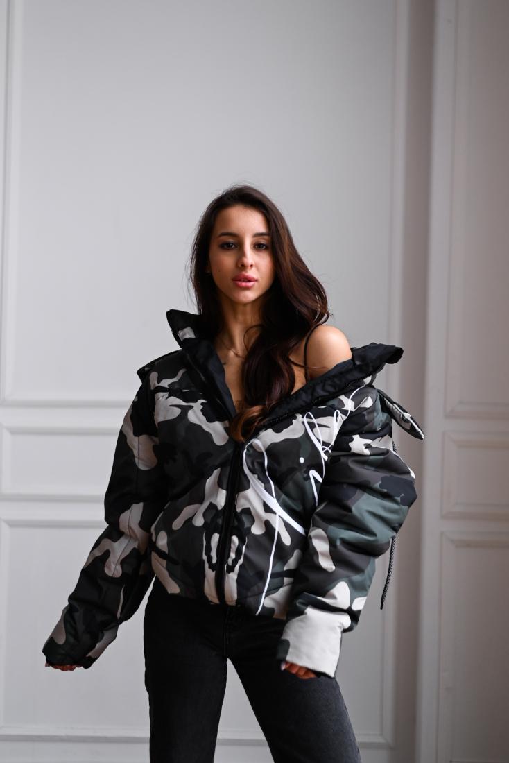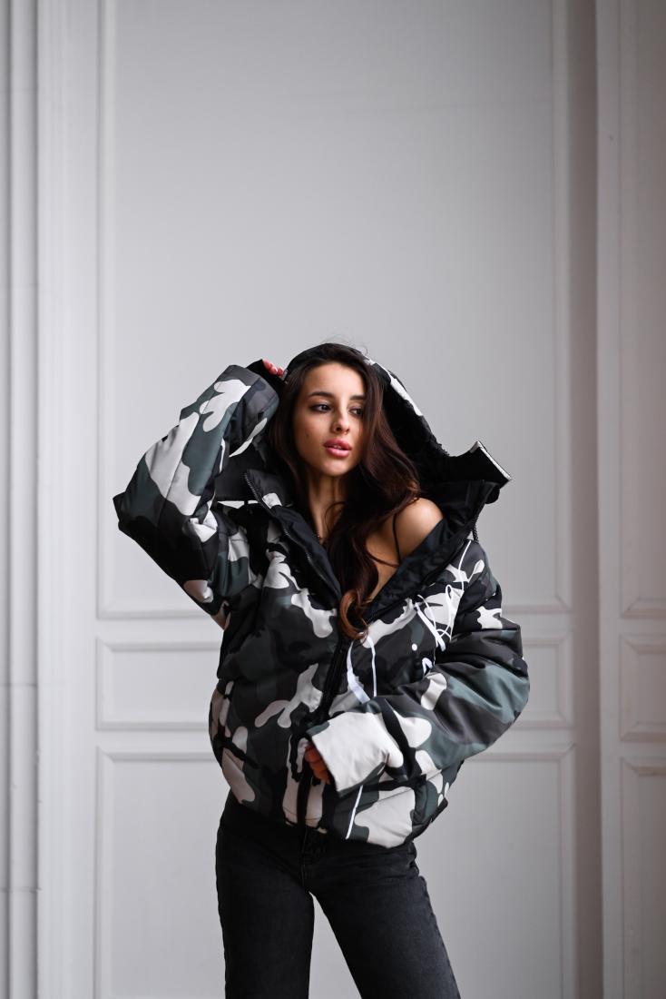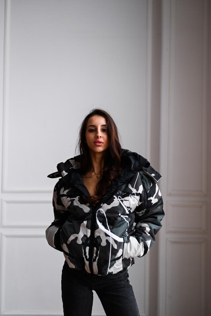 Жіноча Зимова Камуфляжна Чорна Куртка з Принтом на Спині
