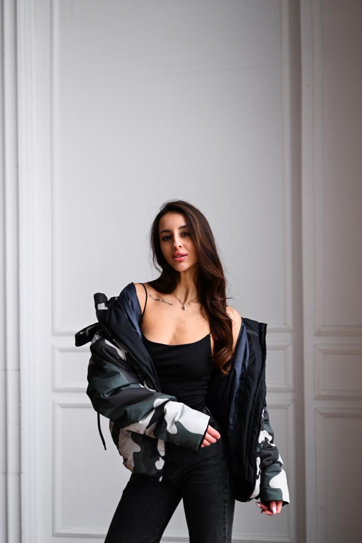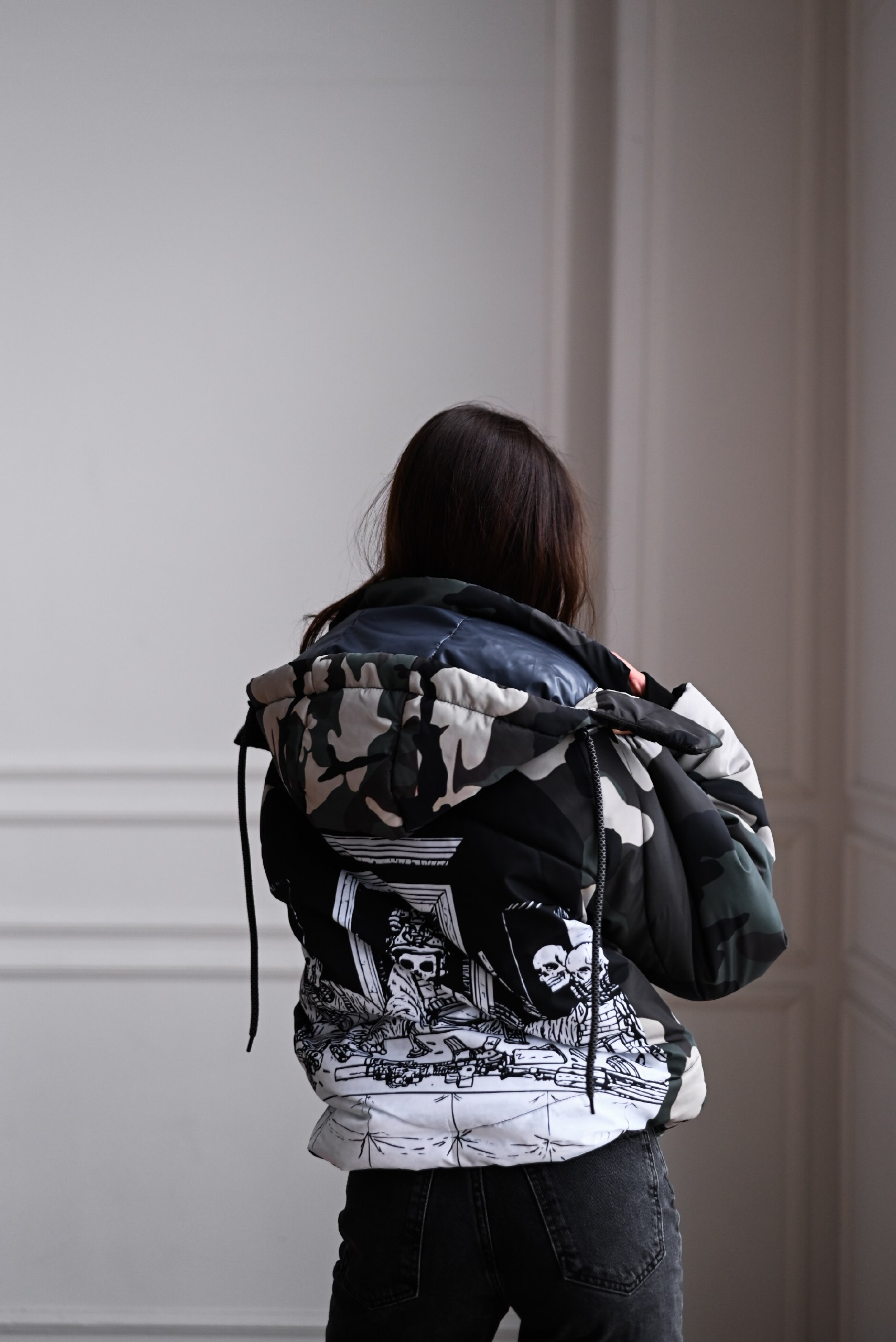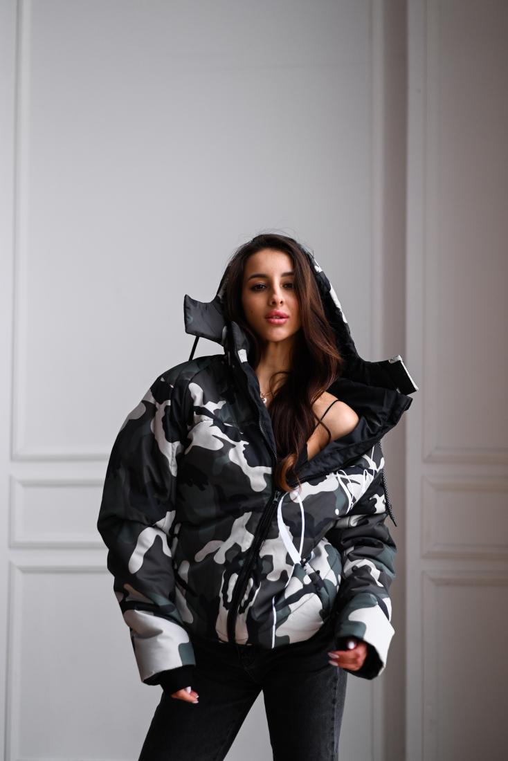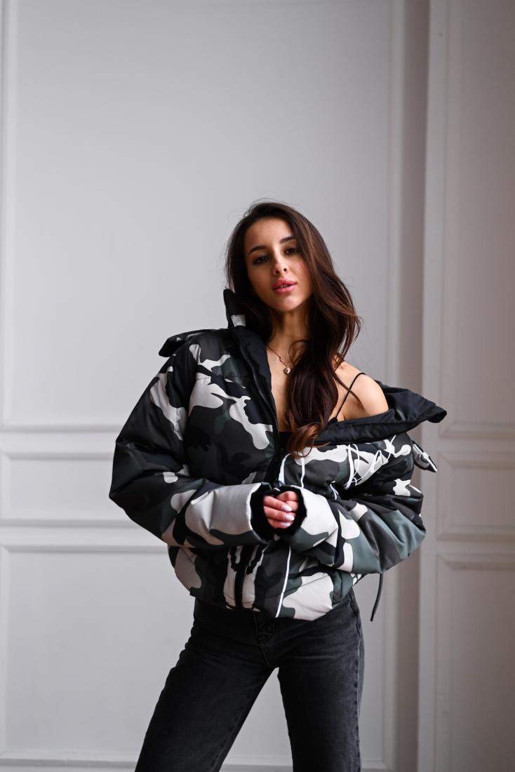 Жіноча Зимова Камуфляжна Чорна Куртка з Принтом на Спині
