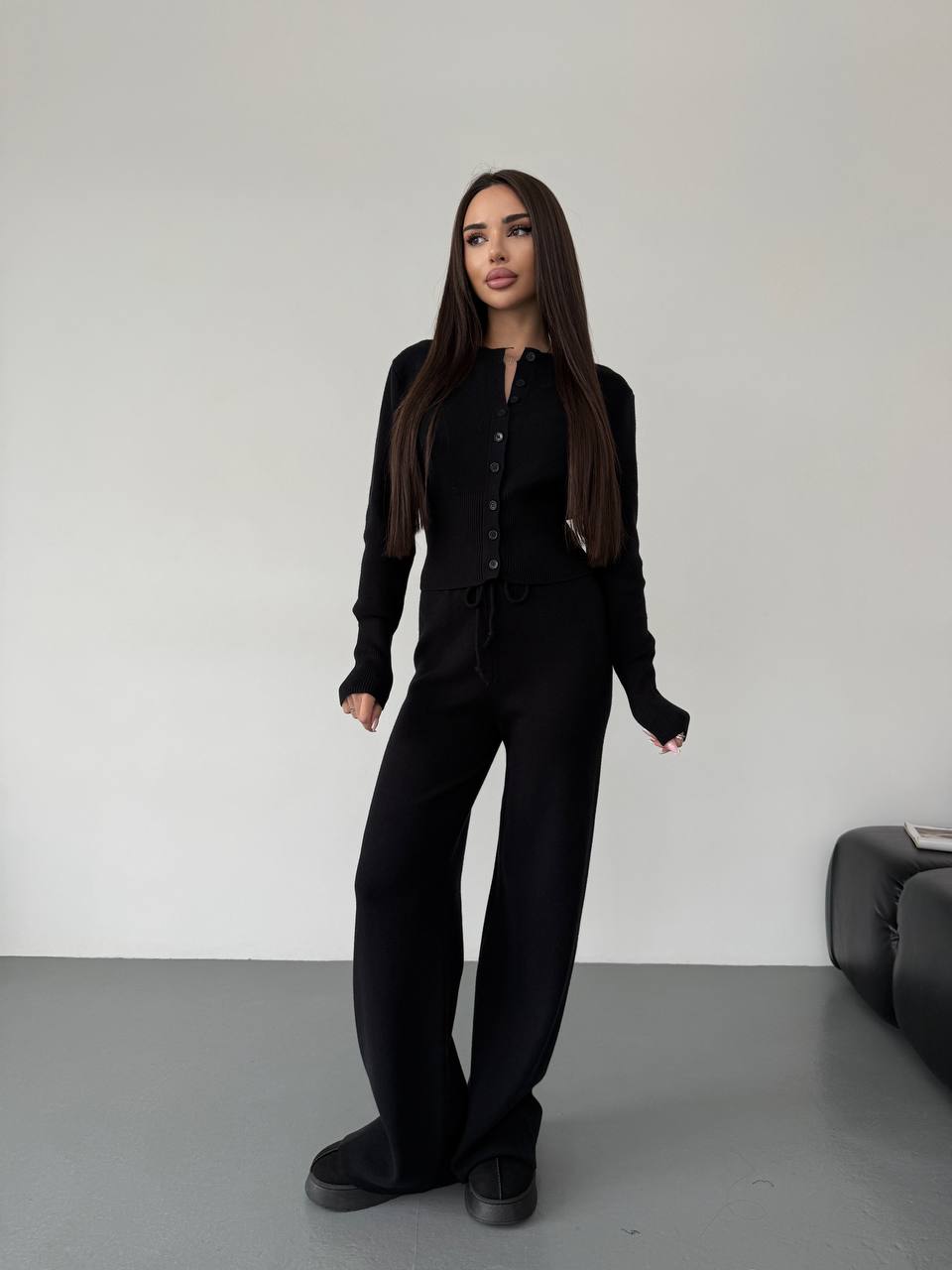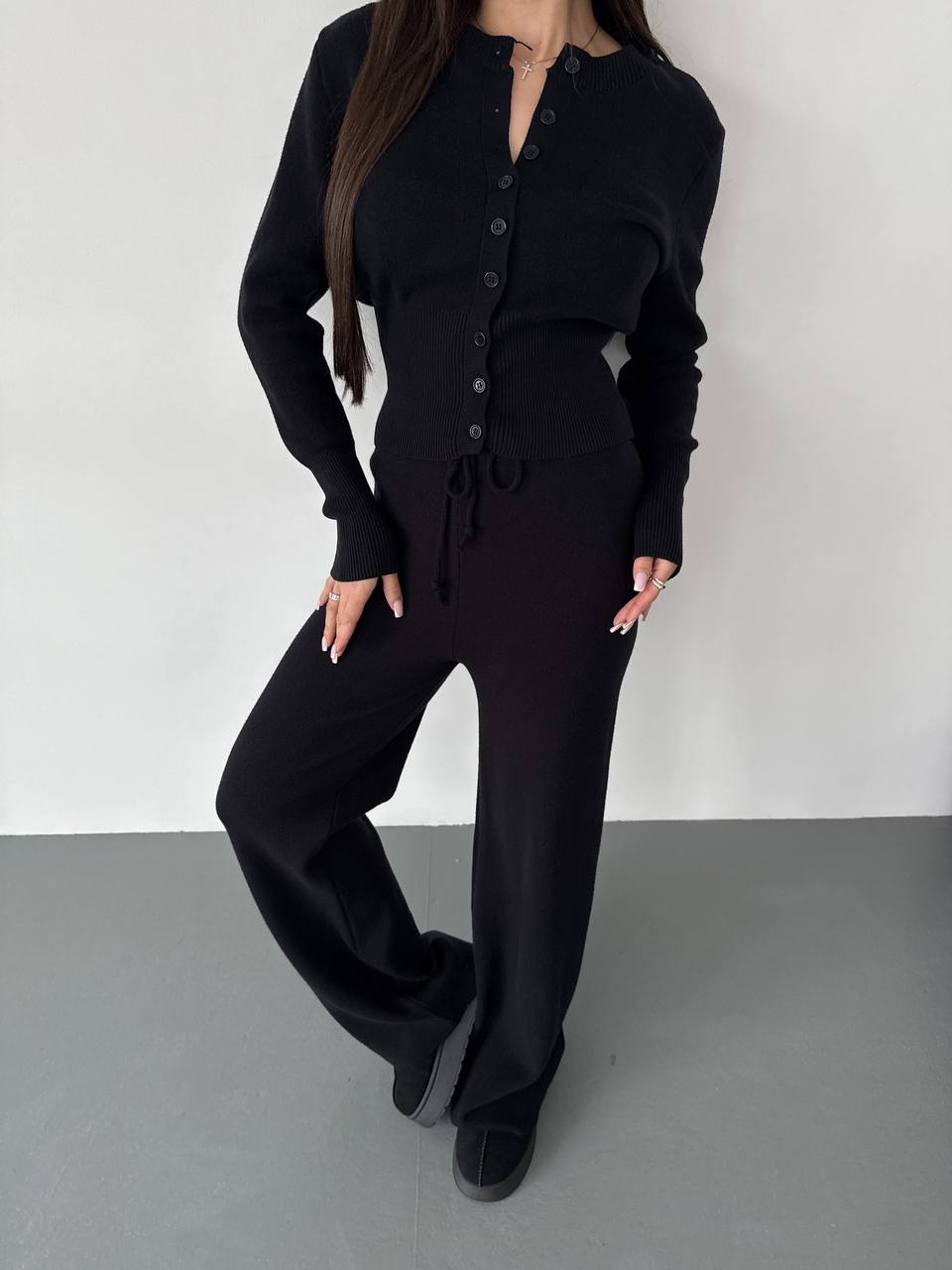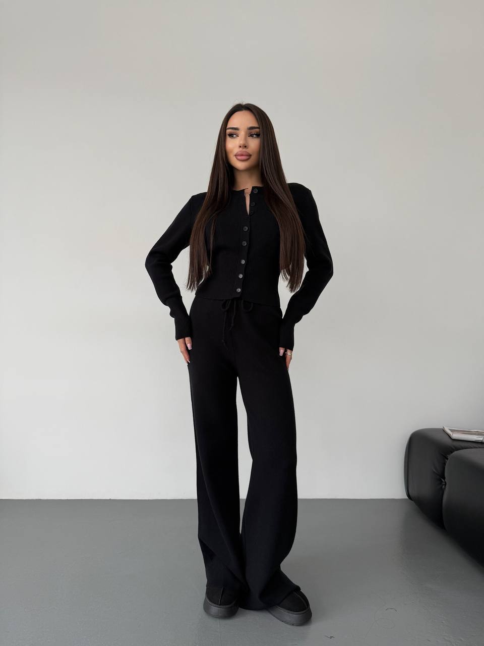 Жіночий Трикотажний Чорний Костюм Комплект Двійка – Приталений Кардиган + Вільні Прямі Штани