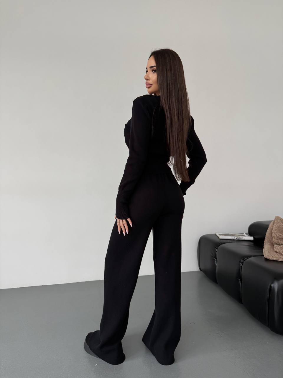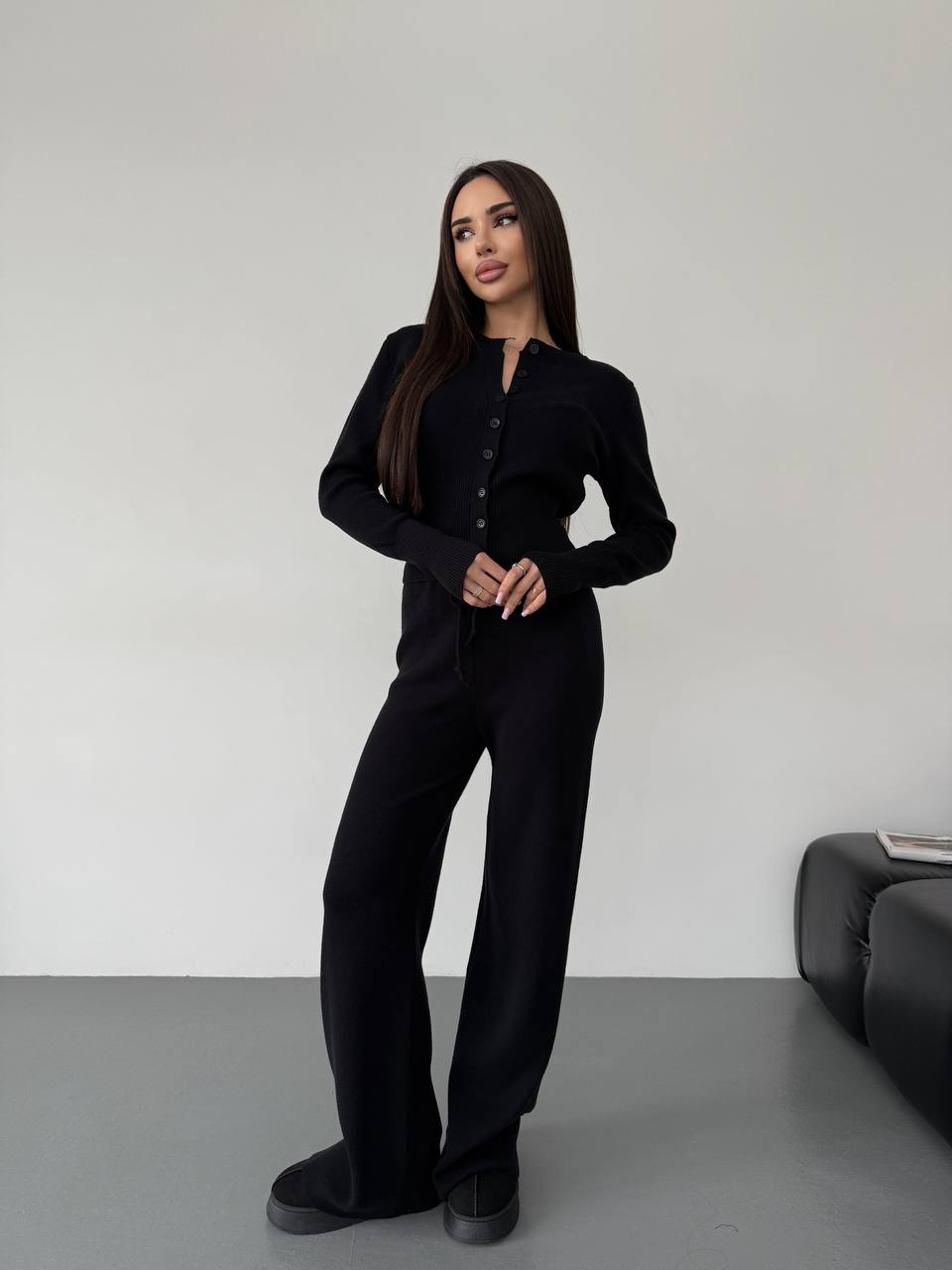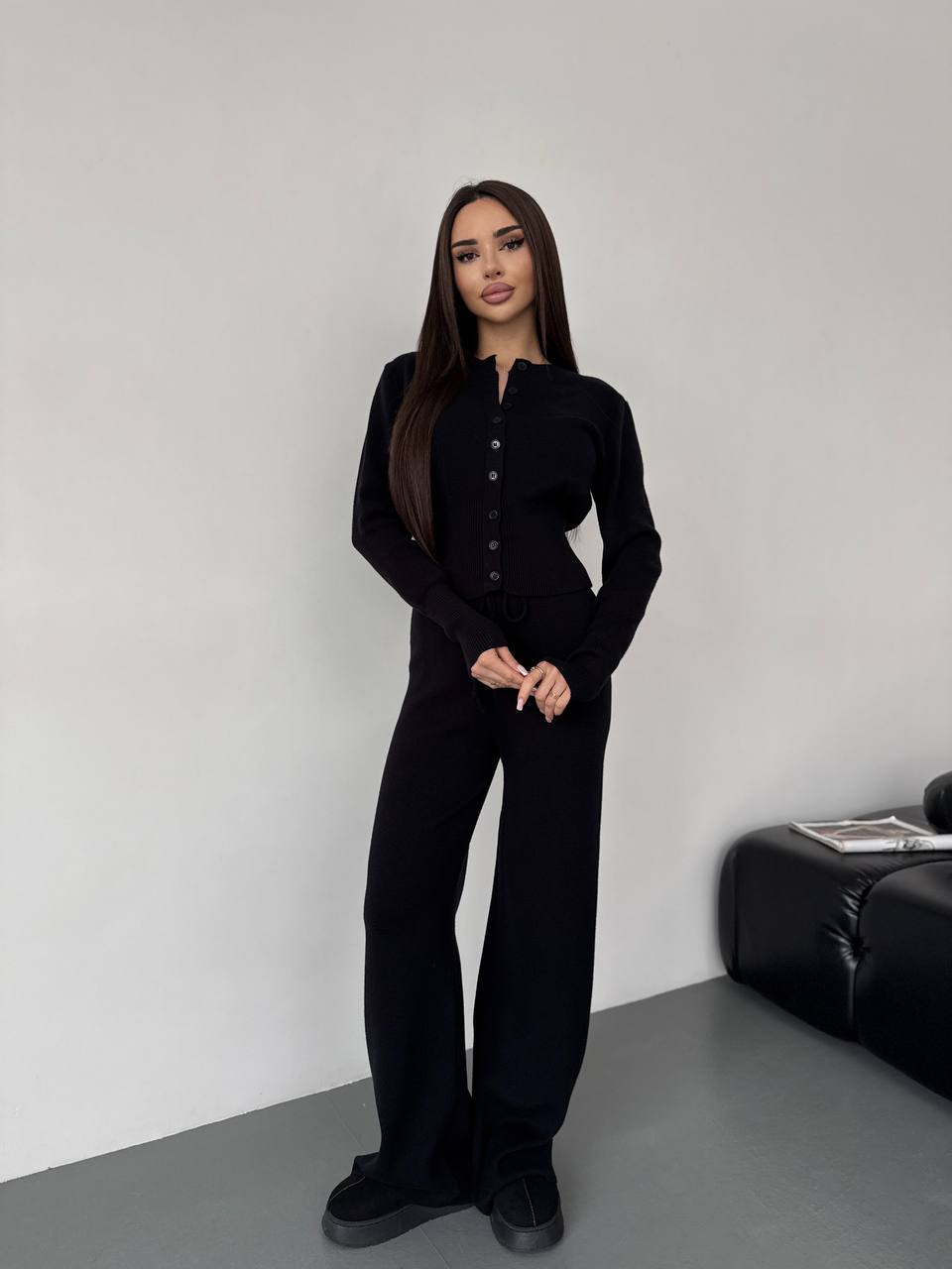 Жіночий Трикотажний Чорний Костюм Комплект Двійка – Приталений Кардиган + Вільні Прямі Штани