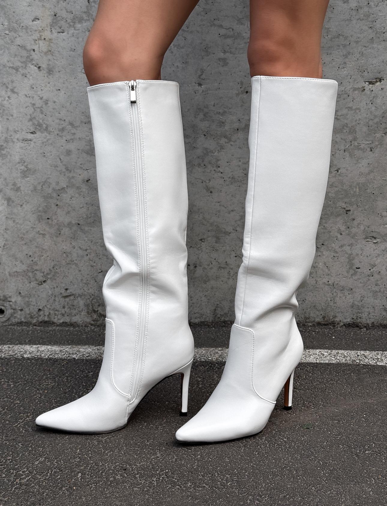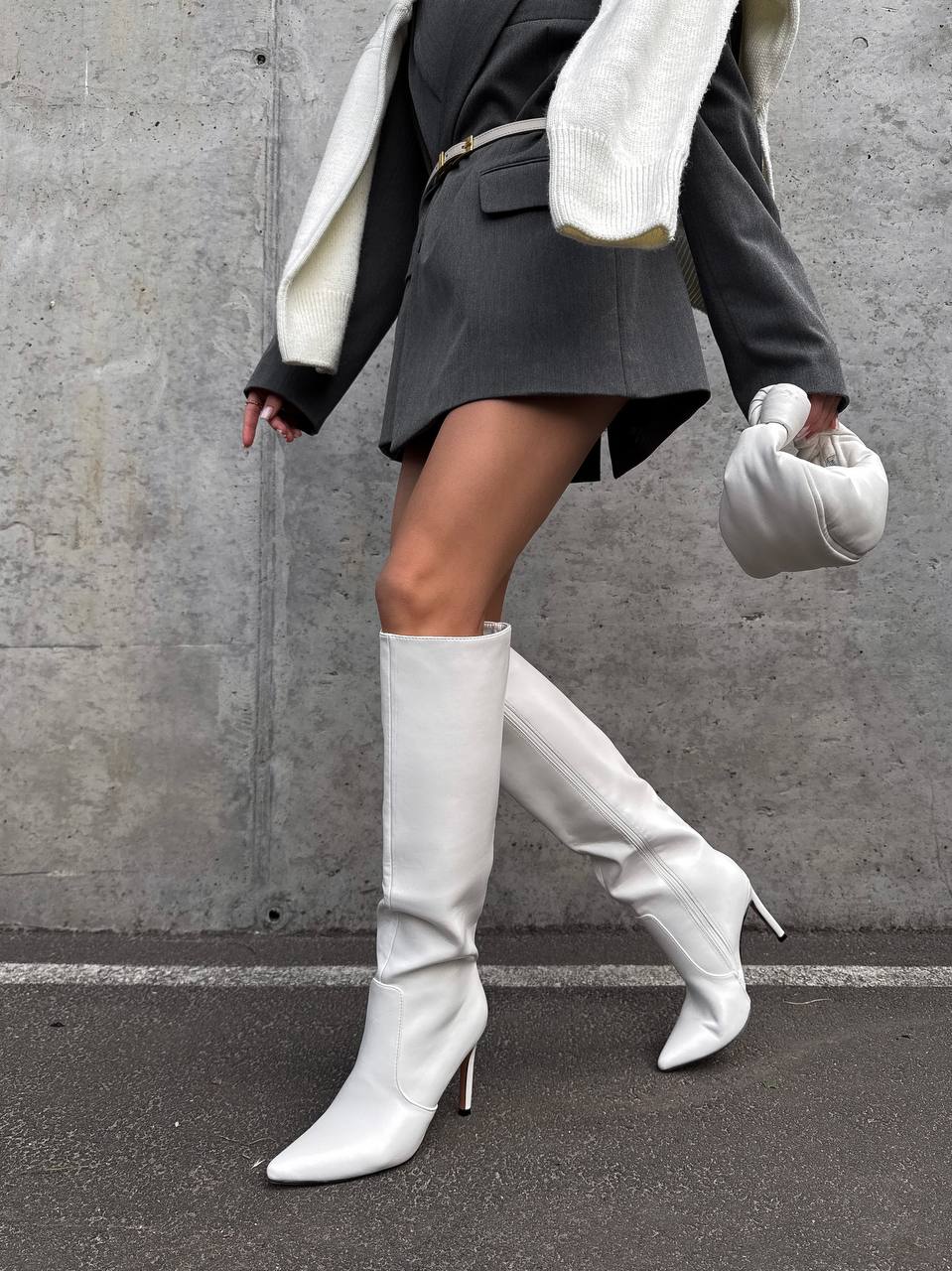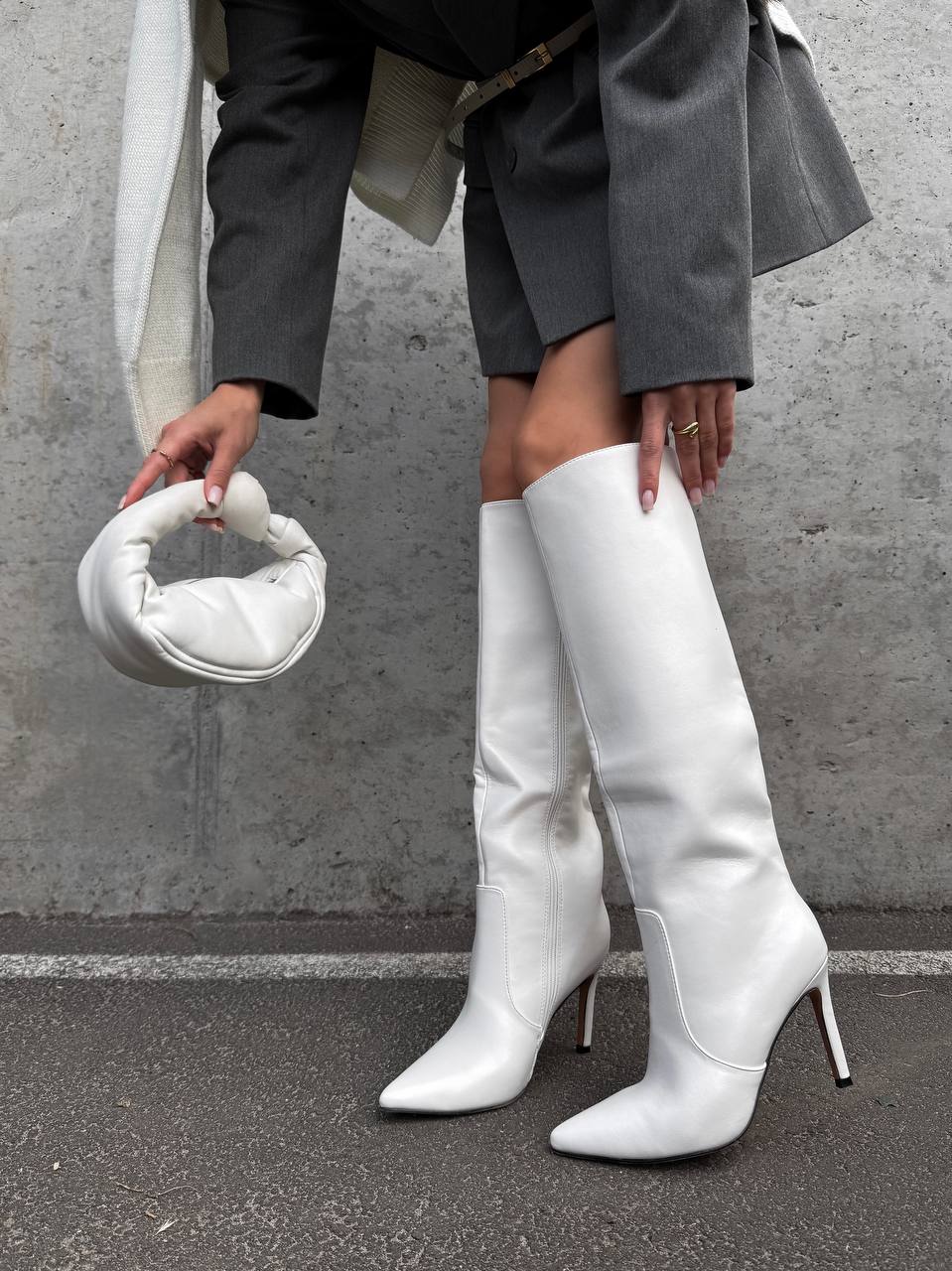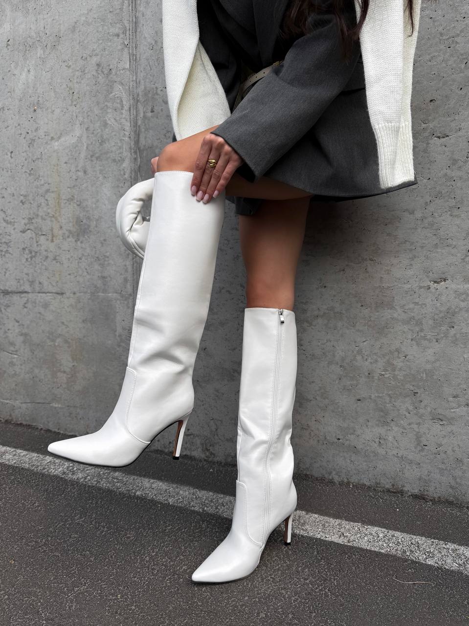 Жіночі Демісезонні Шкіряні Білі Чоботи – Високі на Шпильці