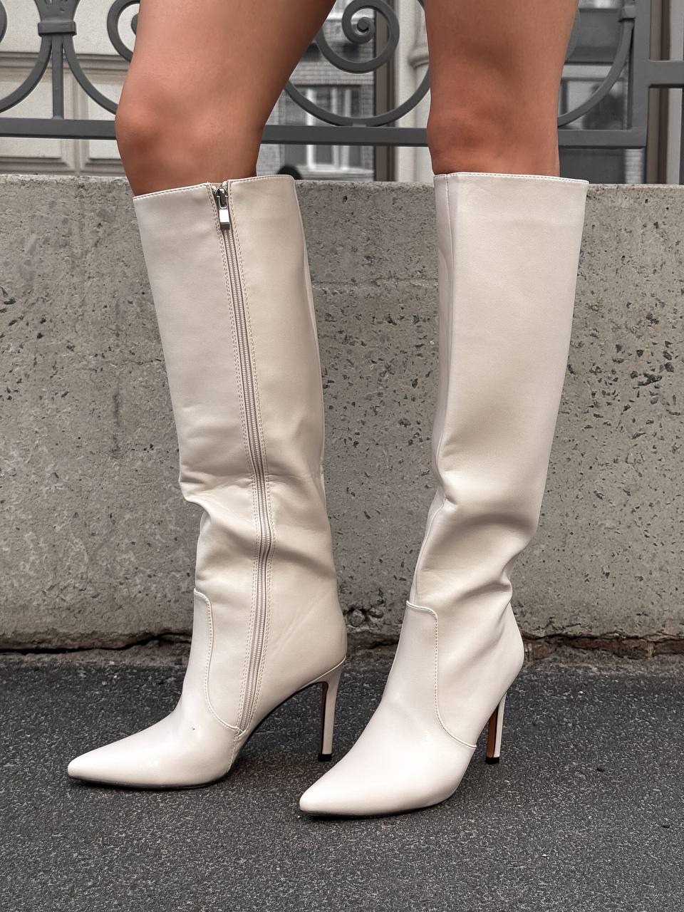 Жіночі Демісезонні Шкіряні Молочні Чоботи – Високі на Шпильці