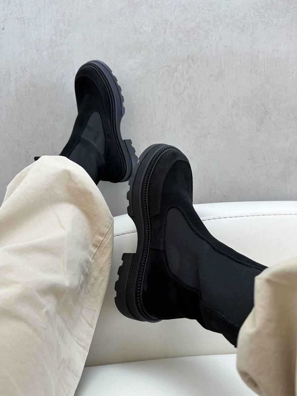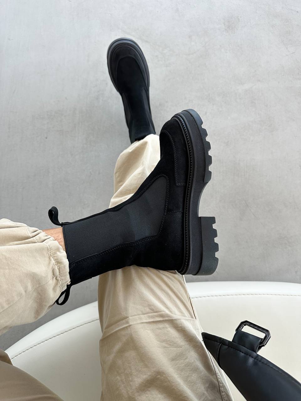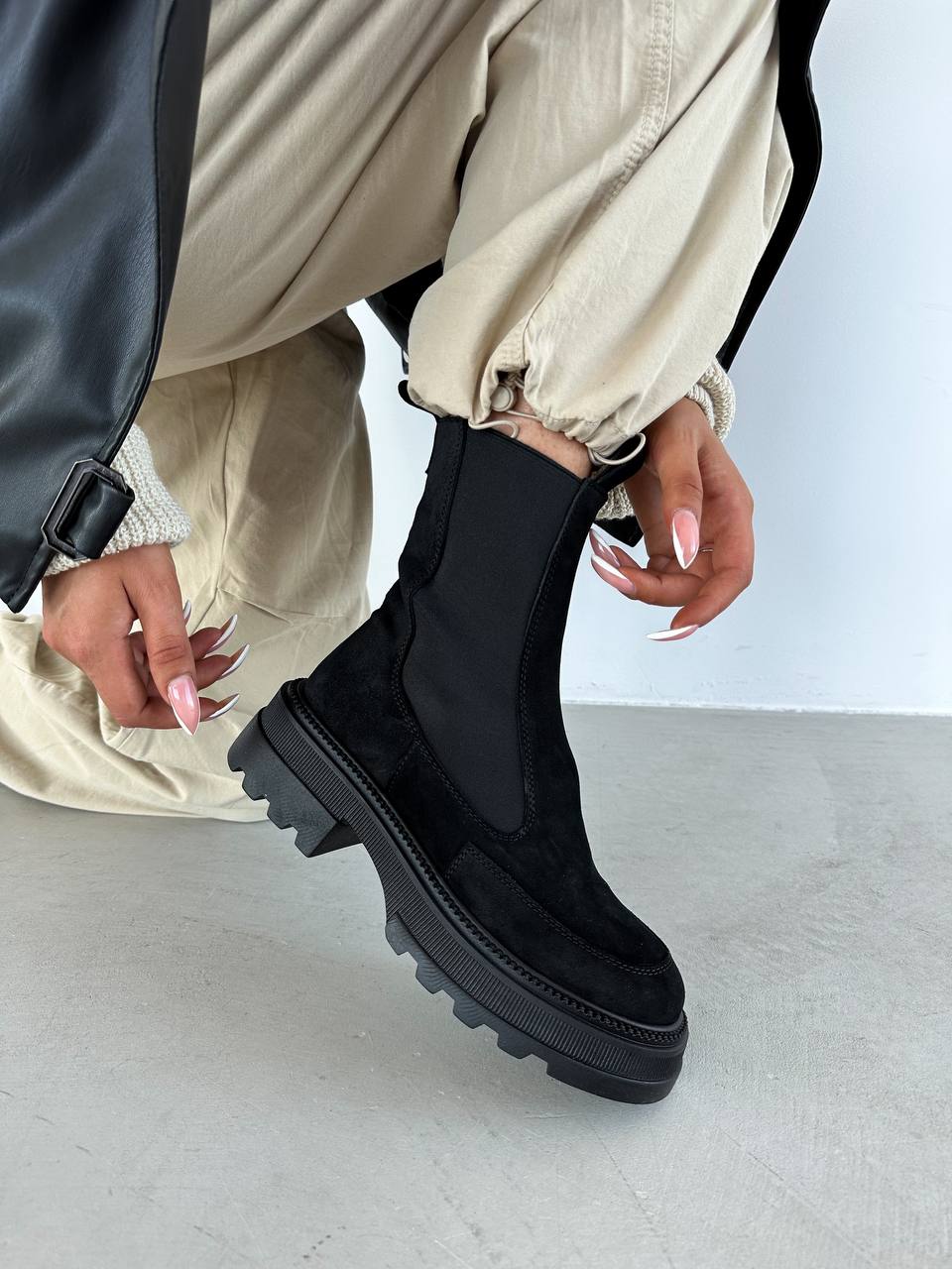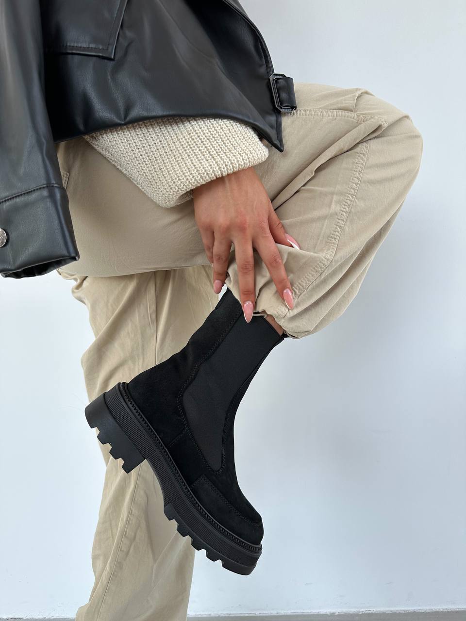 Жіночі Замшеві Зимові Чорні Черевики Челсі на Хутрі з Гумкою по Боках