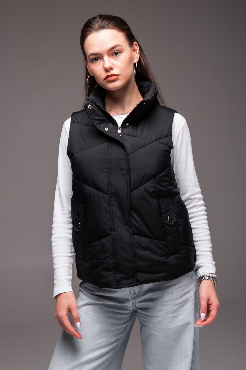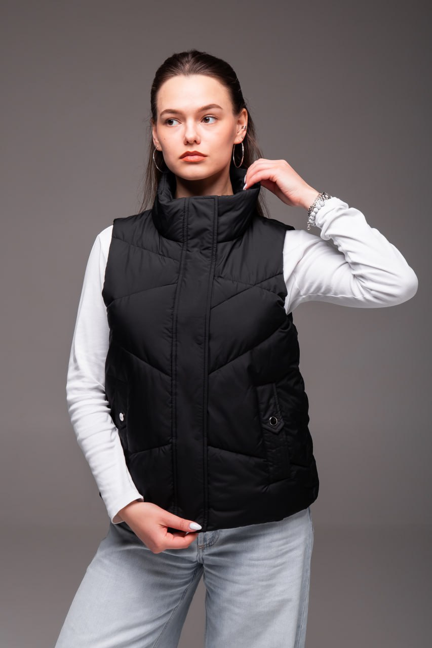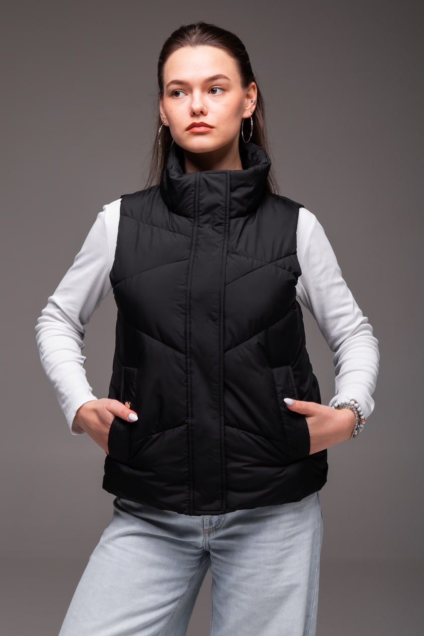 Жіноча Чорна Жилетка Безрукавка – Стьобана з Високим Горлом