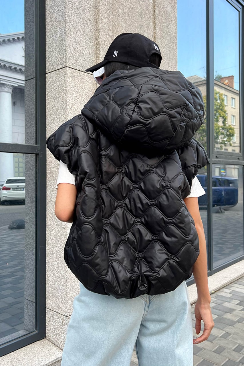 Жіноча Чорна Жилетка Ліфа – Укорочена Стегана Безрукавка з Об’ємним Капюшоном