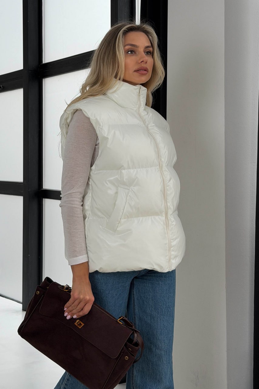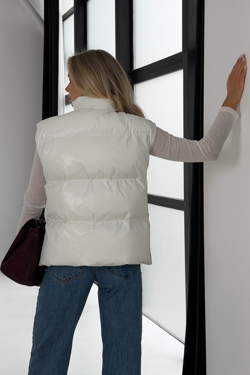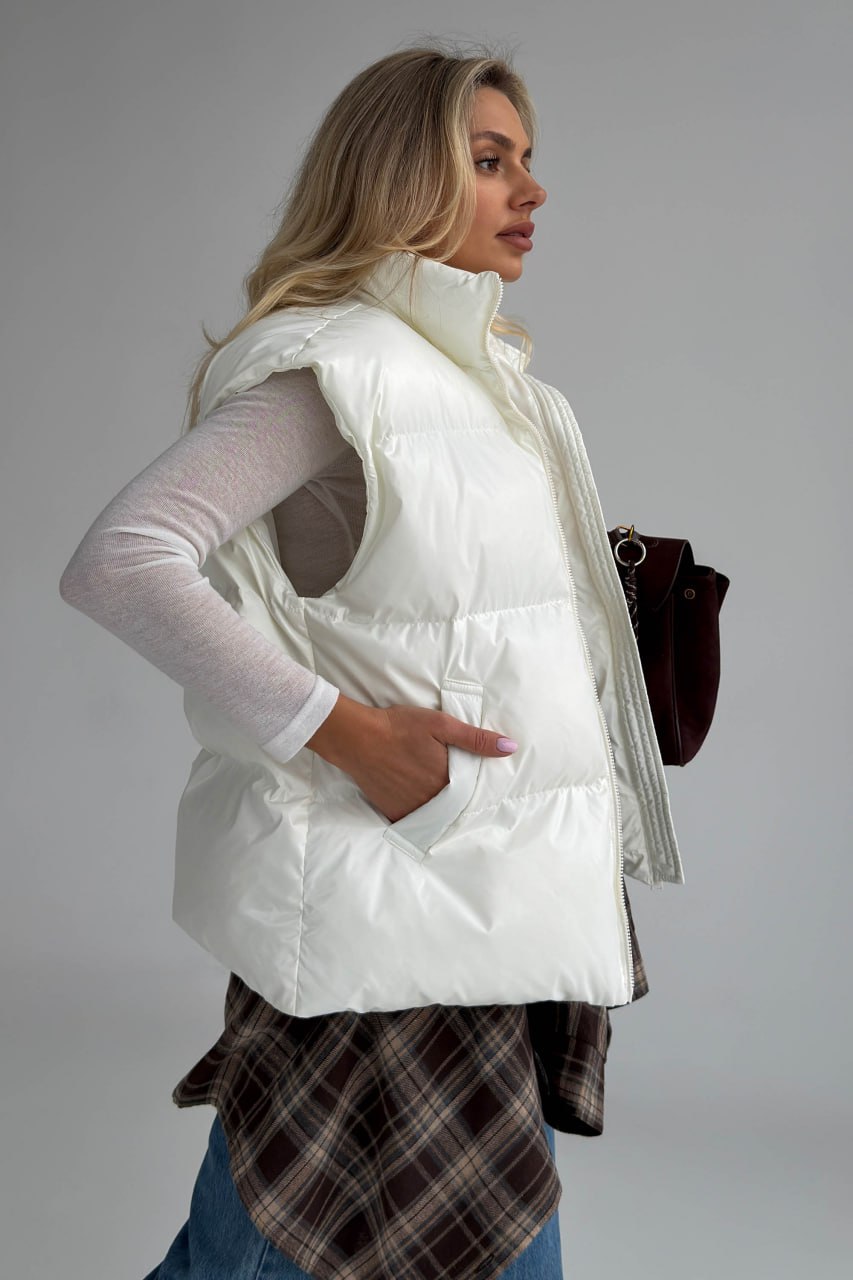 Жіноча Глянсова Стьобана Біла Жилетка Айві Оверсайз з Високим Горлом Стійкою