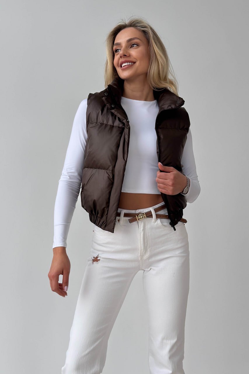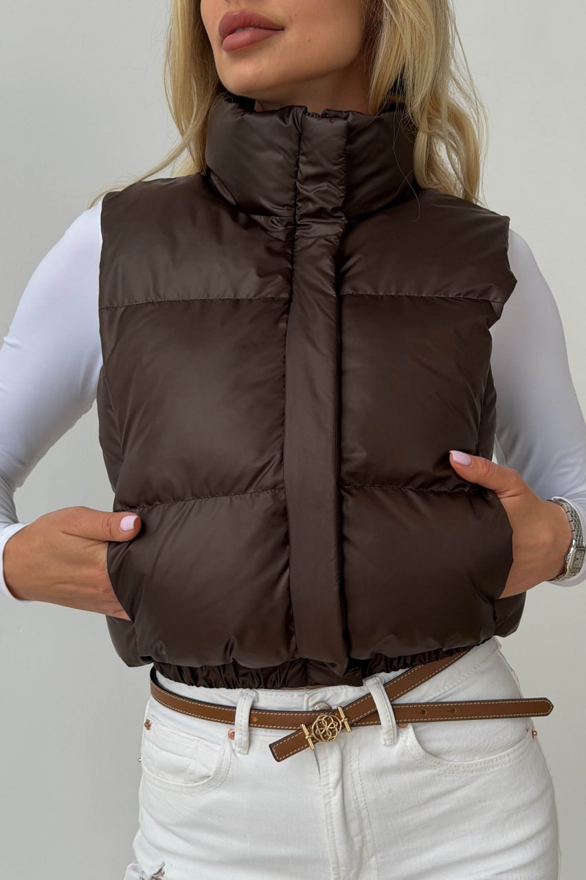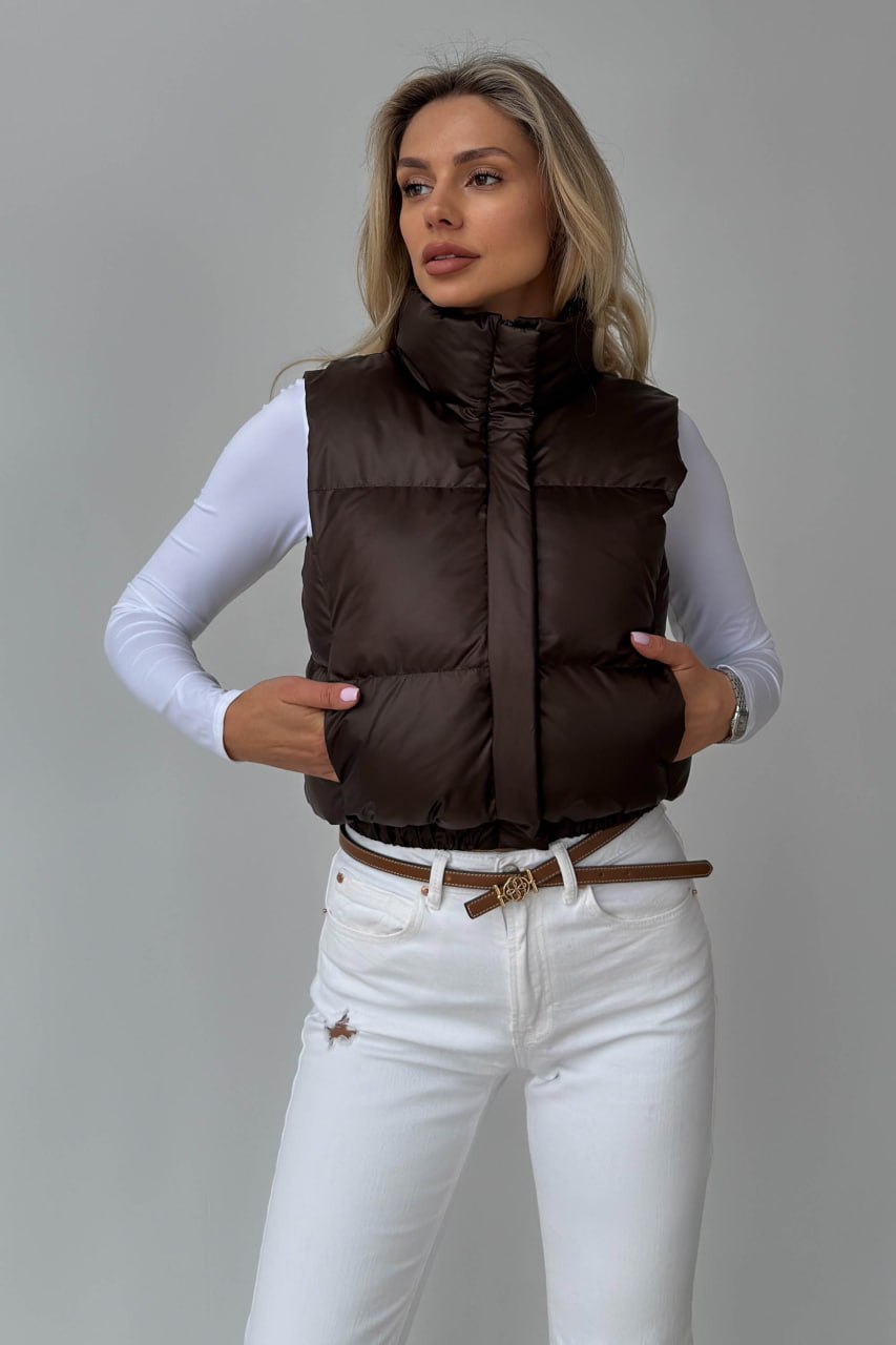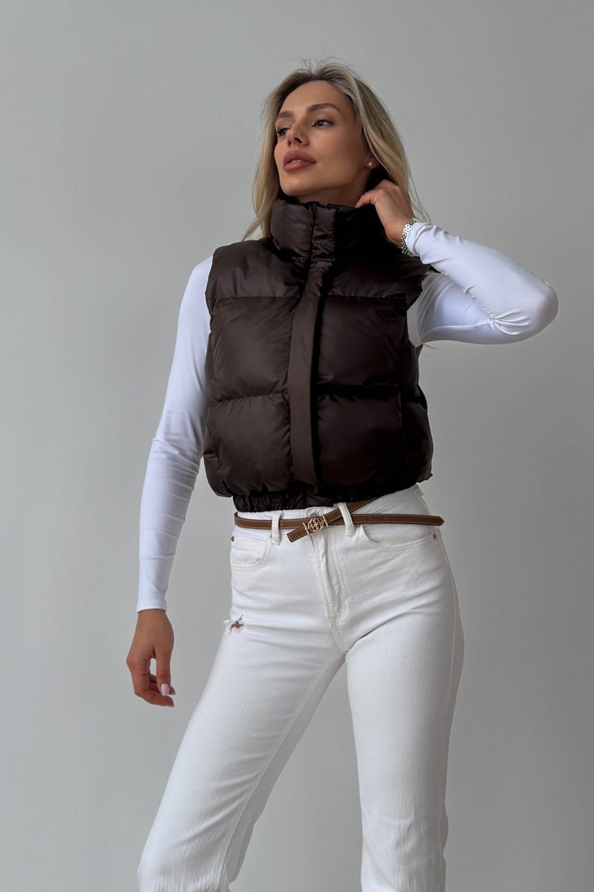 Жіноча Укорочена Коричнева Жилетка Безрукавка Скай з Коміром Стійкою