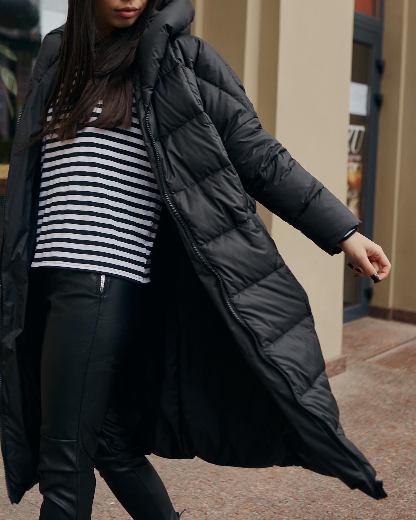 Жіноча Довга Зимова Чорна Куртка Нижче Колін – Стьобана на Блискавці з Капюшоном