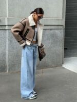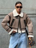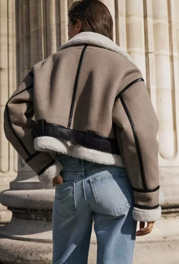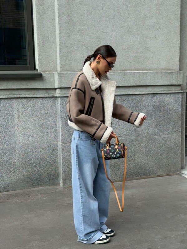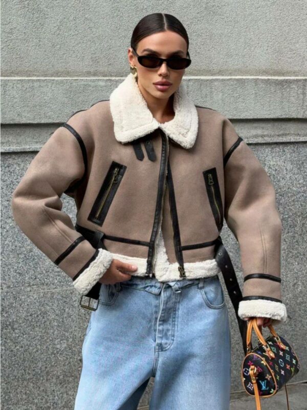 Жіноча Дублянка Мокко на Блискавці з Поясом – Вкорочена Вільна з Чорними Шкіряними Вставками