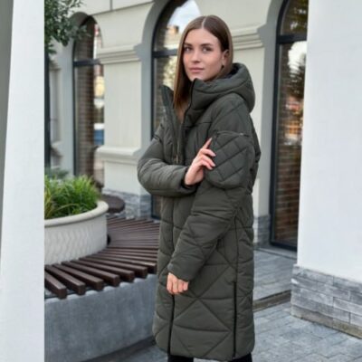 Жіноча Оливкова Куртка Іта Оверсайз – Демісезонна Стьобана з Поясом та Високим Коміром Плащівка