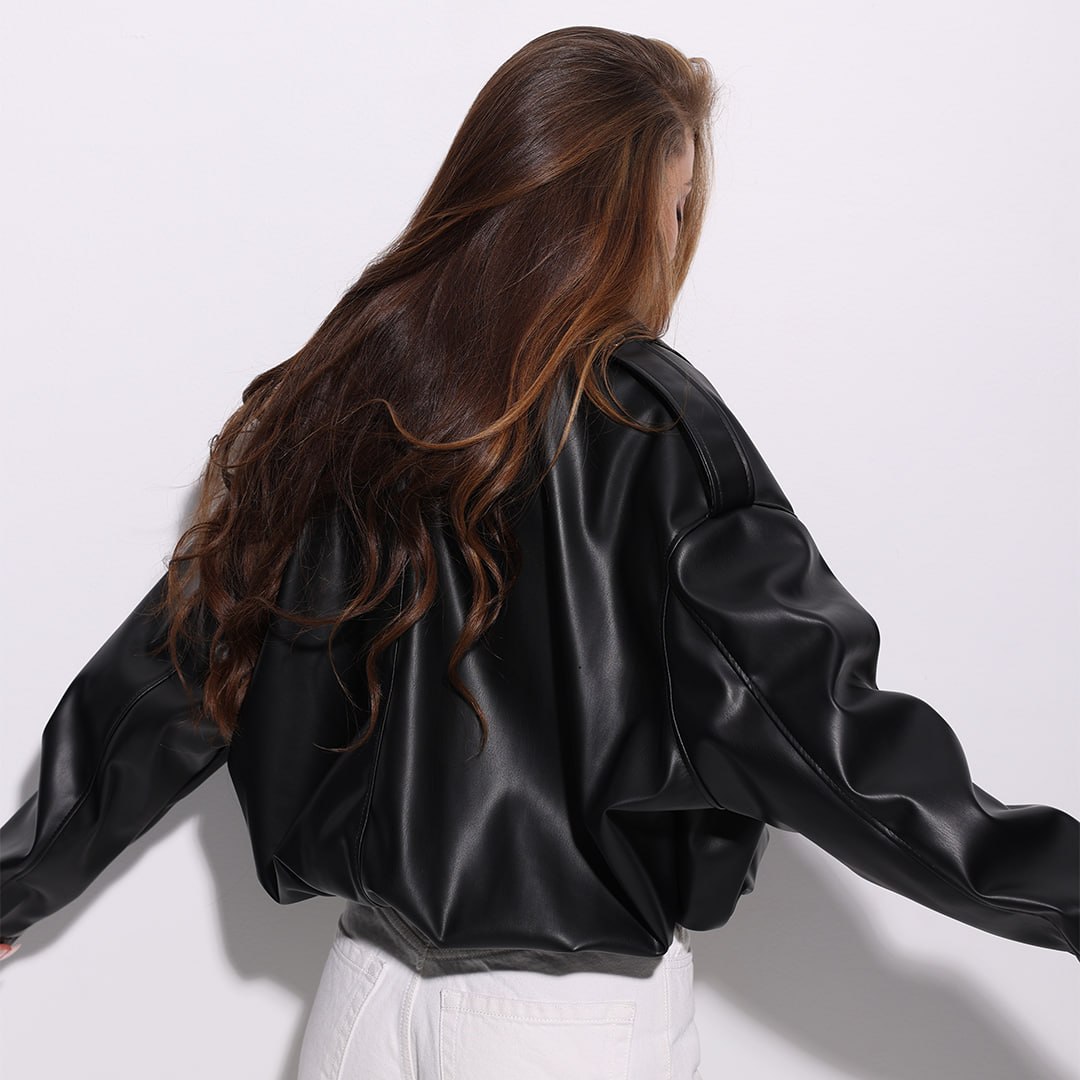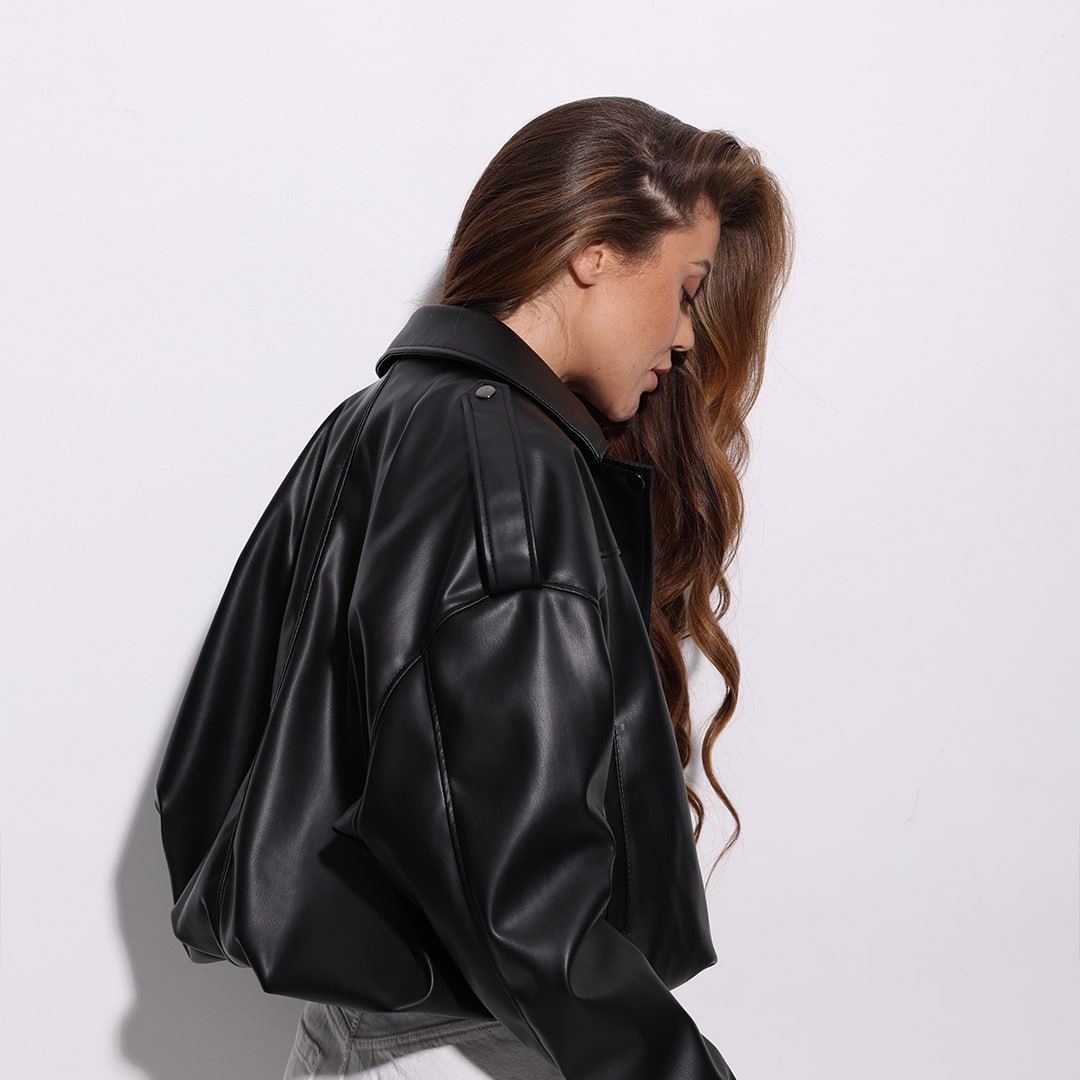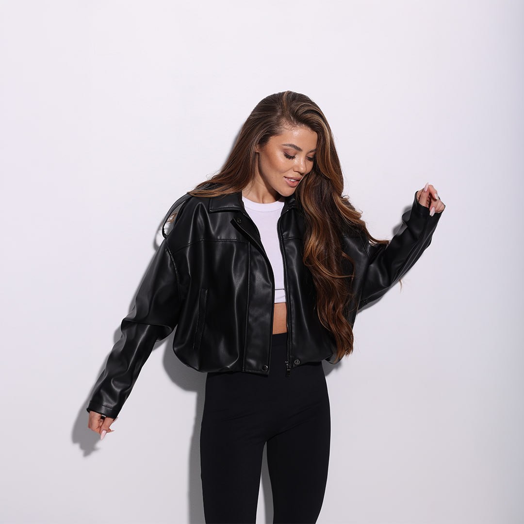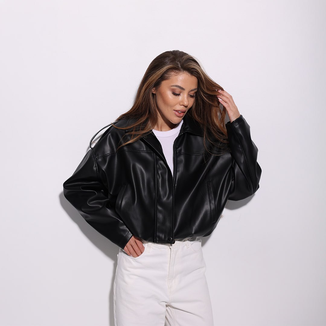 Жіноча Укорочена Чорна Шкіряна Куртка Вільного Крою