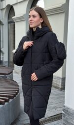 Жіноча Зимова Чорна Куртка-Пальто – Подовжена з Капюшоном і Карманом, що відстібається, на Рукаві.