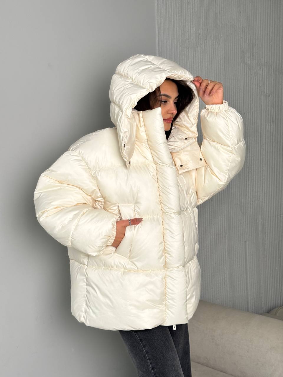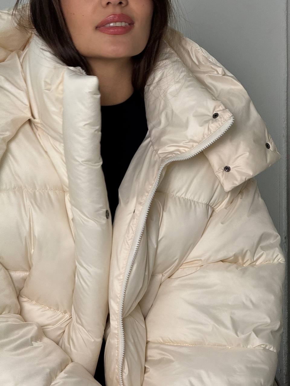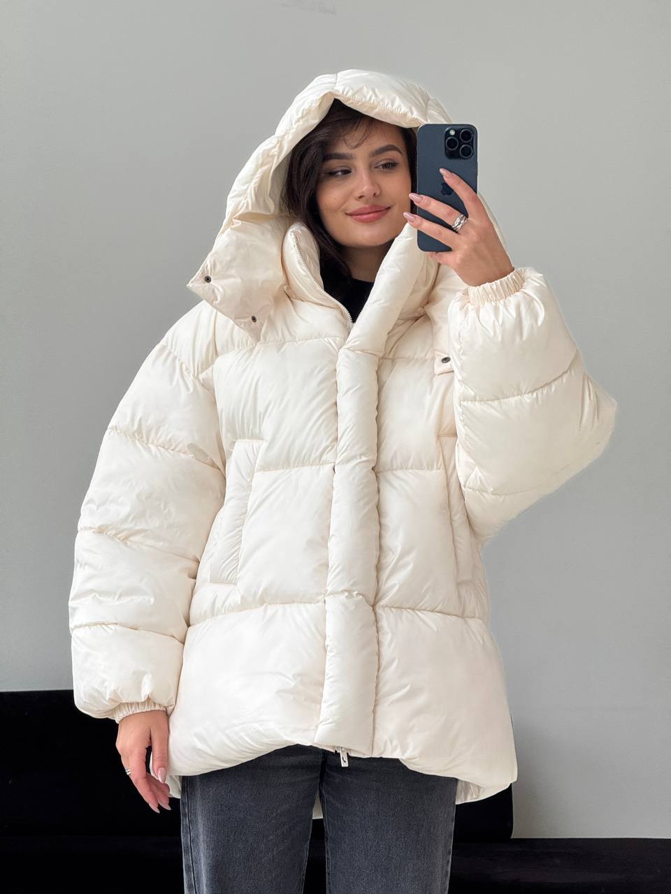 Жіноча Зимова Об’ємна Молочна Куртка Пуховик Оверсайз з Капюшоном
