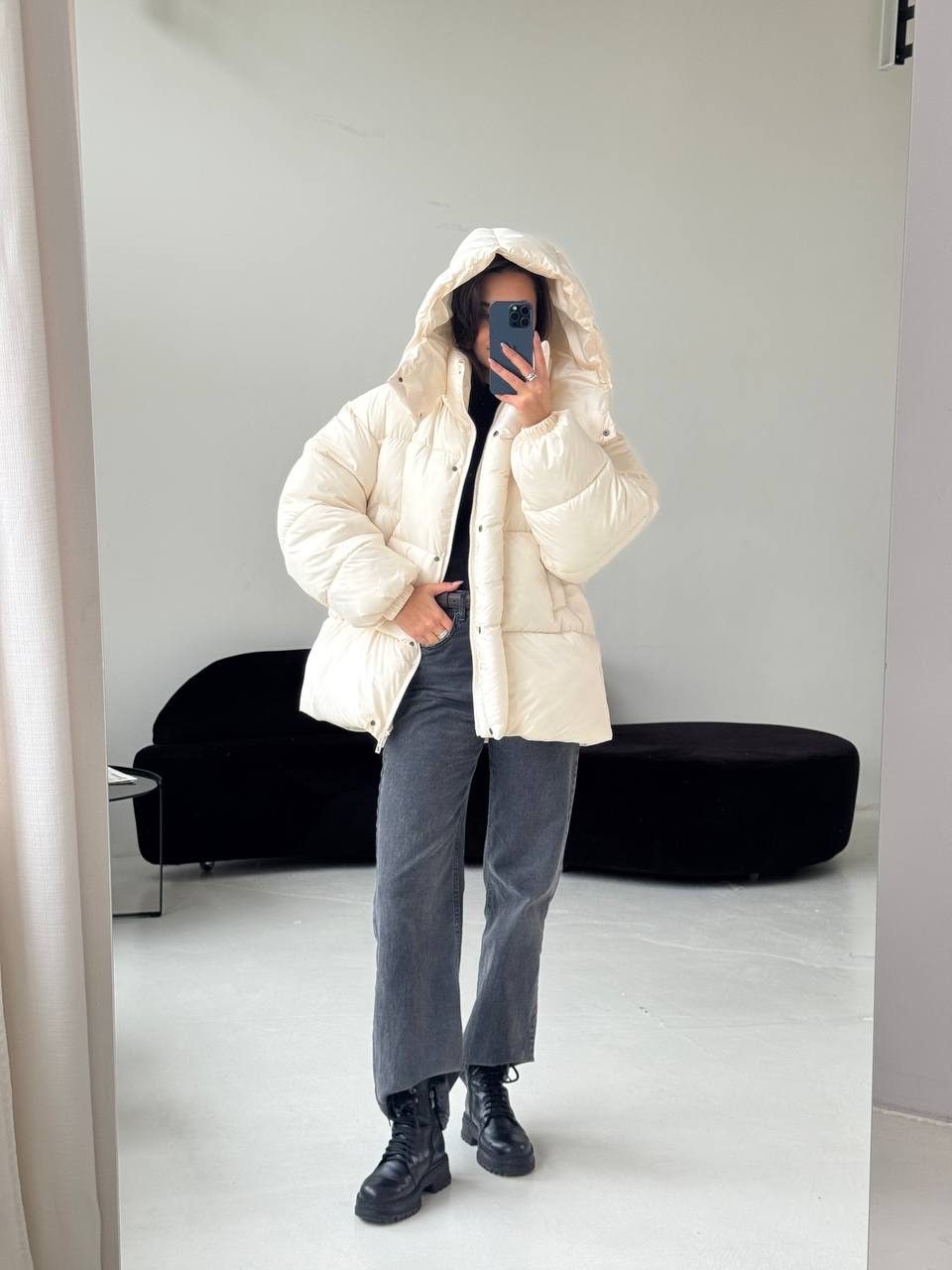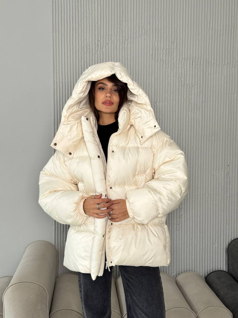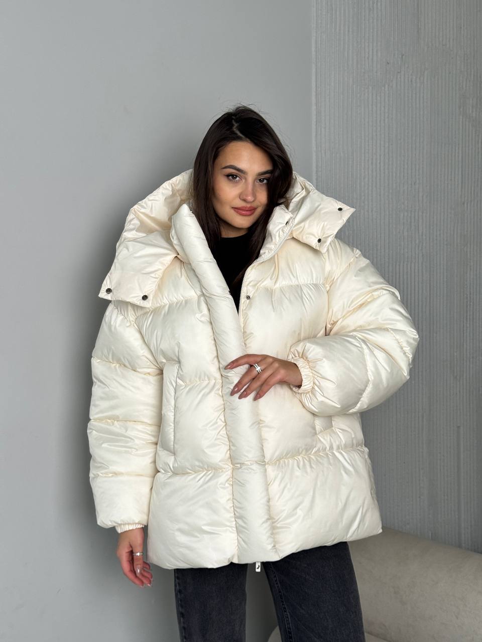 Жіноча Зимова Об’ємна Молочна Куртка Пуховик Оверсайз з Капюшоном
