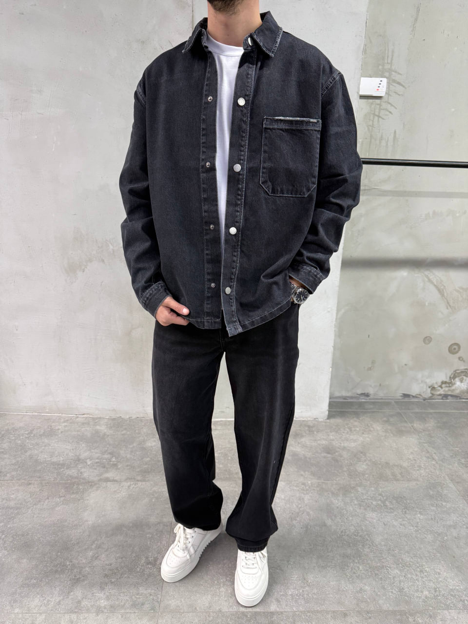 Чоловіча Базова Графітова Джинсова Сорочка Вільного Крою на Кнопках