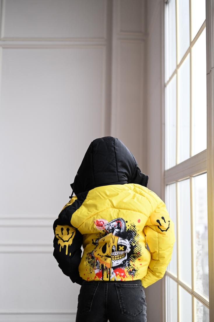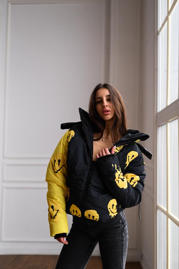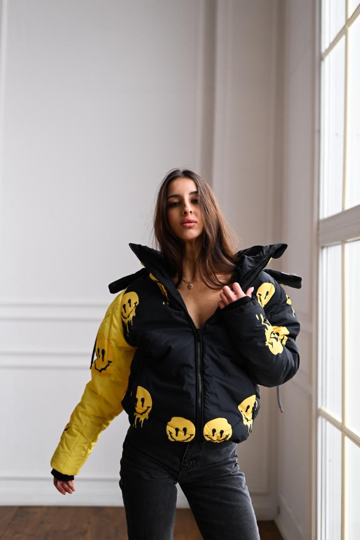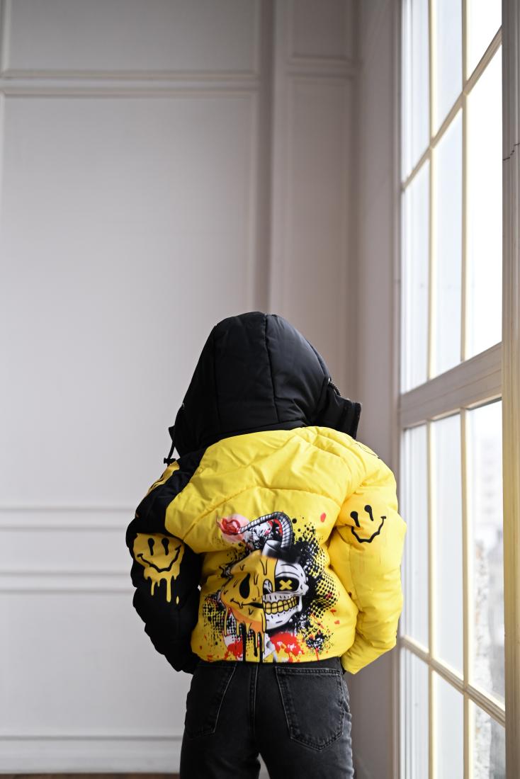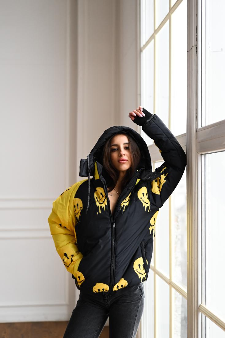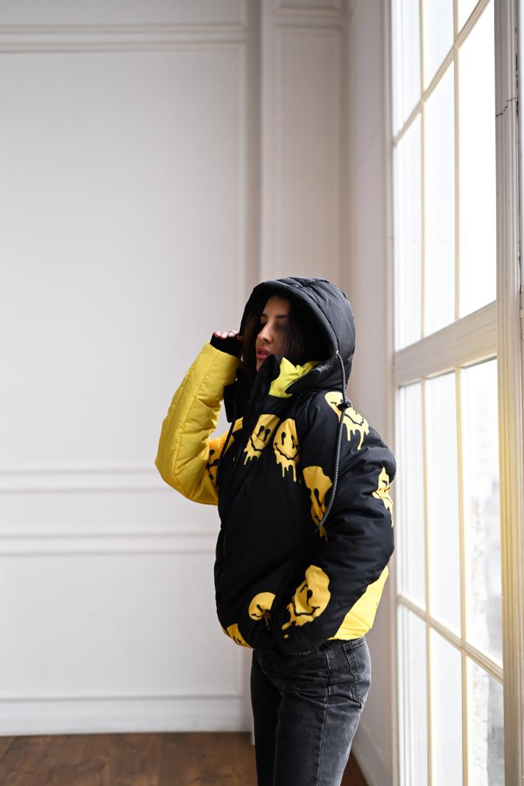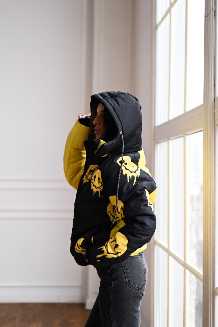 Жіноча Зимова Чорно-Жовта Куртка з Капюшоном в Принт