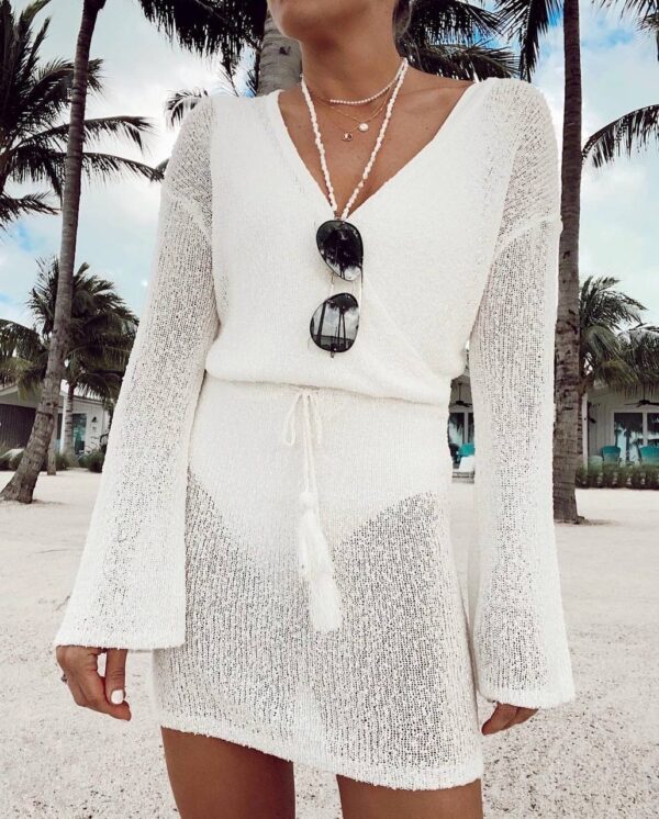 Жіноча Біла Пляжна Туніка – Вільного Крою в Сіточку із Зав’язкою на Талії